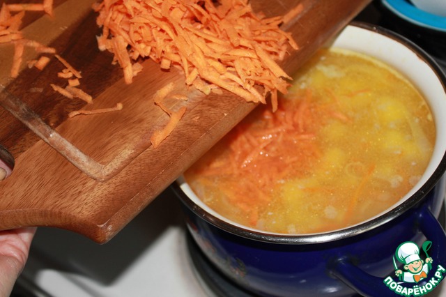 Добавить морковь и картофель в суп и варить до их готовности. Приправить солью и майораном.
