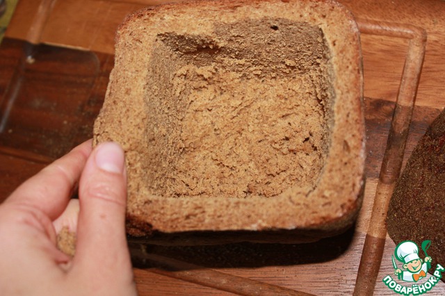 С хлебных буханок срезать верхушки, из серединок вынуть мякиш, оставив достаточно толстые стенки.