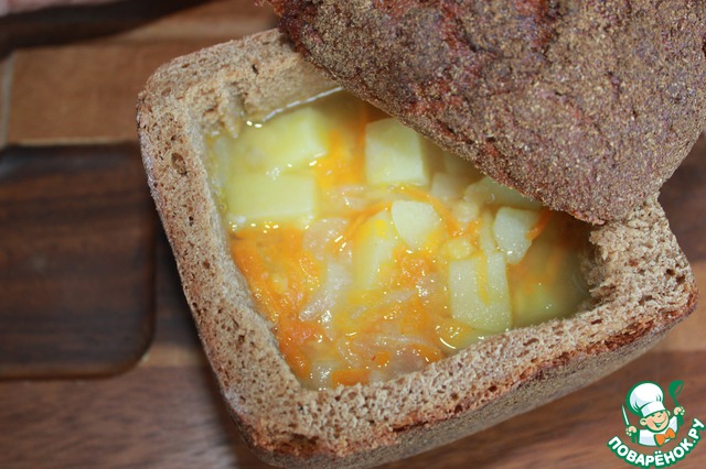 Разлить готовый суп по хлебным тарелкам и подавать на стол.