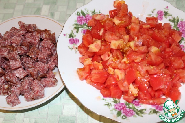 Колбасу и помидоры нарезаем кубиками среднего размера.
