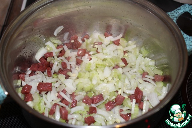 Наливаем в большую кастрюлю с толстым дном оливковое масло, добавляем нарезанную колбасу. Готовим на сильном огне, приблизительно 2 - 3 минуты, пока колбаса не выделит жир.