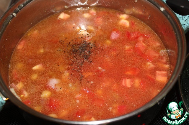 Добавляем нут, нарезанные помидоры, бульон, томатный сок, приправляем все это солью и перцем. Готовим на слабом огне в течение 20 минут (после закипания), помидоры за это время станут мягкими, а горох впитает все ароматы.