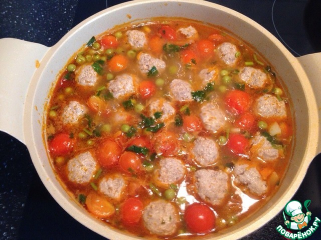 Мясной фарш смешиваем с яйцом, перцем, солью и формируем фрикадельки (размер грецкого ореха). Можно добавить чуть муки. и чтоб фарш не прилипал к руке, пока вы делаете шарики, одну руку постоянно смачивайте водой.