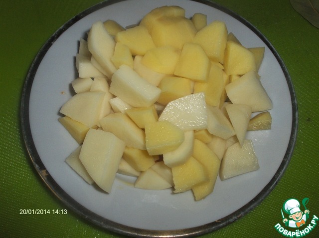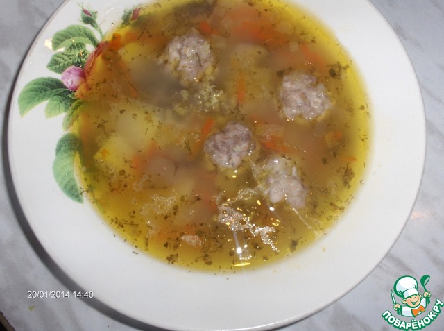 Через 10 минут добавить в суп картофель и фрикадельки, лавровый лист, посолить. Я еще положила приправу для супов (она без соли, только одни травы. Вот состав:перец черный молотый, лавровый лист дробленый, тимьян, мята перечная, укроп сушеный, перец душистый молотый, мускатный орех). И варим еще 10-15 минут на небольшом огне. И все, готово!