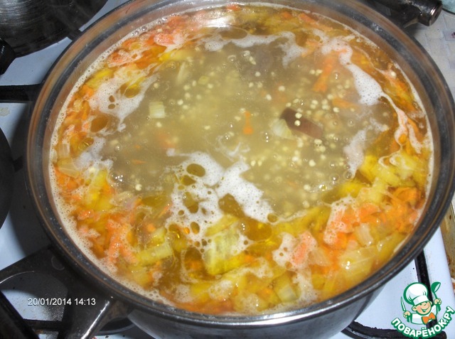 В кипящий бульон опустить пшено, поджарку из лука, моркови и грибов. Варим минут 10.