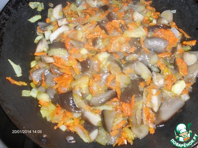 Разогреть немного подсолнечного масла на сковороде (ложки 2), положить туда лук с морковью, немного обжарить и добавить нарезанные грибы, кубиками. Все вместе потушить пару тройку минут и снять с огня.