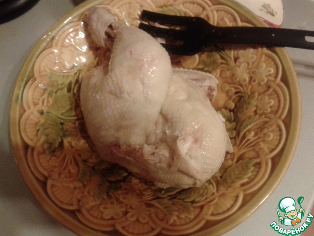 Для начала, варим куриный бульон. Когда он готов, вынимаем курицу и оставляем остывать.