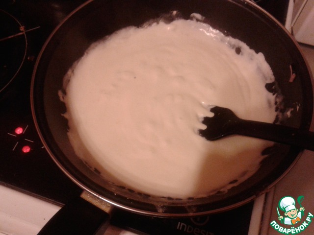 Дальше готовим сметанную заправку. На растительном масле обжариваем муку, тщательно помешивая. Затем вводим к муке сметану и продолжаем мешать. Получившийся соус добавляем к бульону и хорошенько размешиваем, чтобы сметана растворилась. Удобнее это делать в сотейнике, куда потом добавляется бульон, но у меня сотейника подходящего не нашлось, поэтому соус приготовила в сковороде и ввела в кастрюлю с бульоном