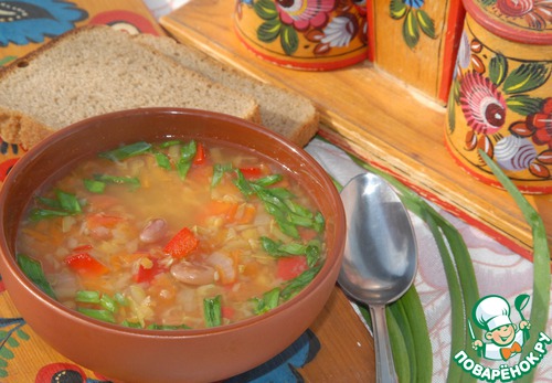 | Густой овощной суп с фасолью и чечевицей. По вкусу немного напоминает рассольник. |