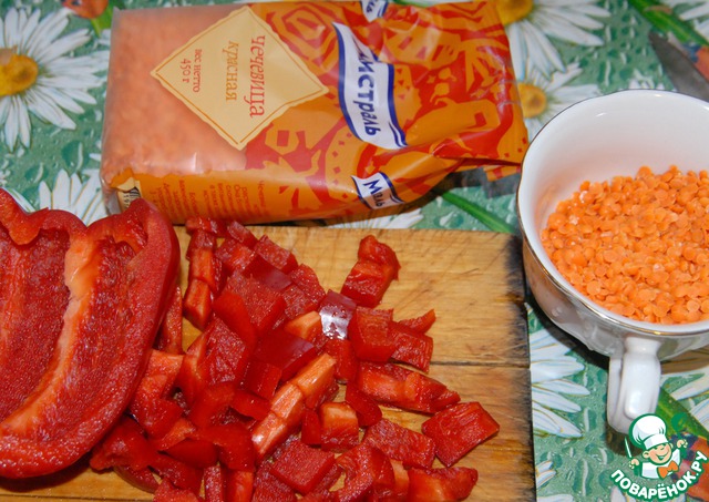 Перец и чечевицу моем, перец чистим, режем и вместе с чечевицей отправляем в кастрюлю. Варим еще 10 мин.