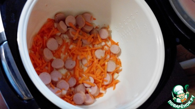 Добавить немного растительного масла и положить морковь, лук и сосиски в мультиварку