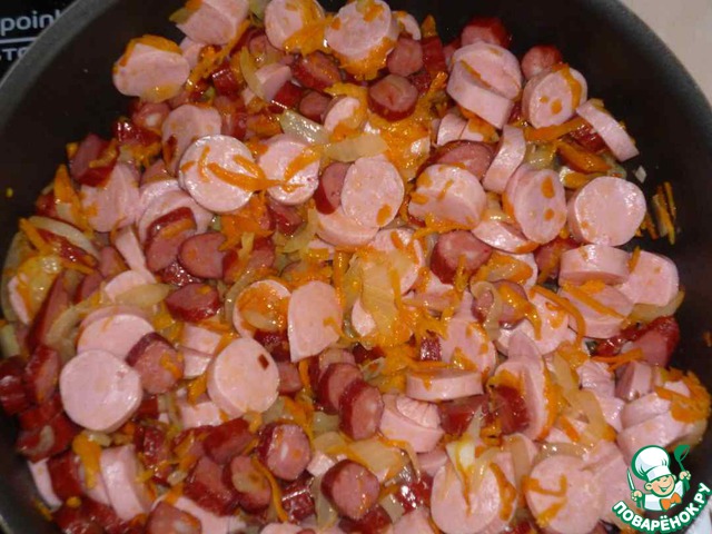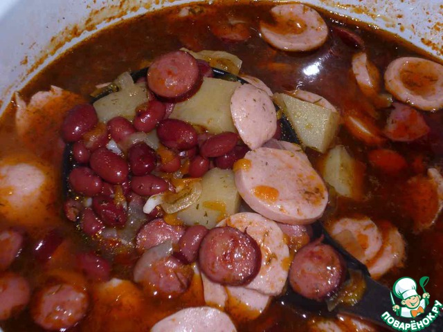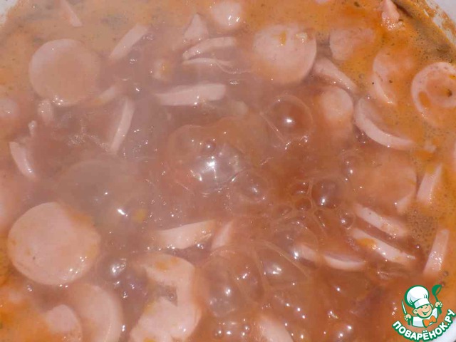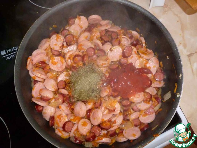 Когда картошка будет почти готова, выложить наши сосиски с овощами, фасоль (прям с соусом в котором они были), специи