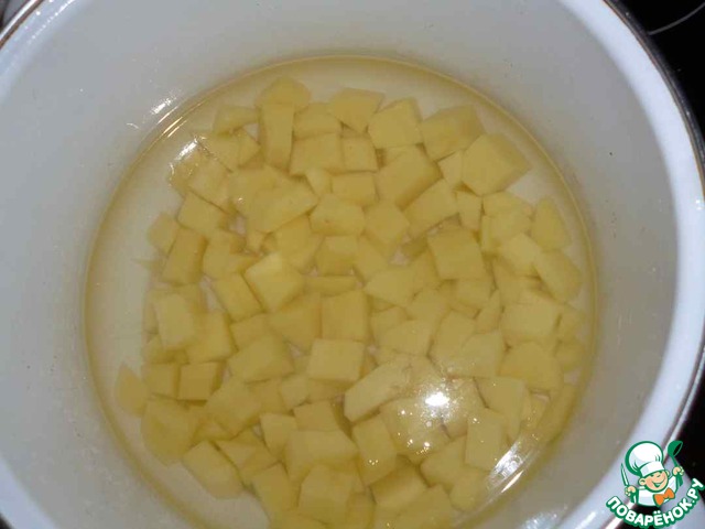 Порезать картофель кубиками, выложить в кастрюлю и налить воды, наливайте так чтоб покрыть картофель, не более, иначе у вас вода будет потом выкипать