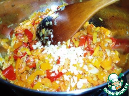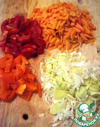 Лук-порей мелко нарезать, морковь нарезать тонкой соломкой, болгарский перец – небольшими кубиками.