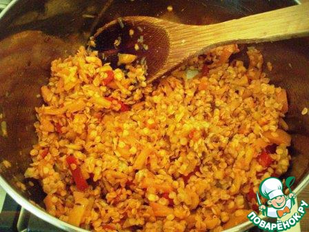 Добавить чечевицу и все специи, все опять очень хорошо перемешать