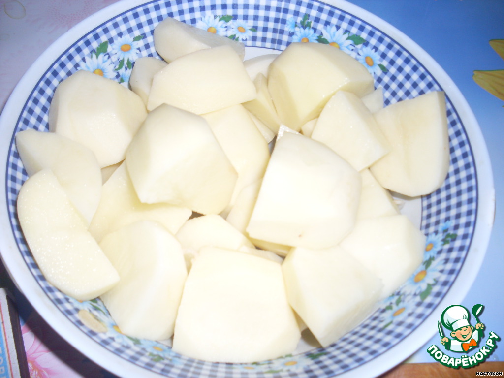 потом добавляем картофель -его тоже надо резать крупно