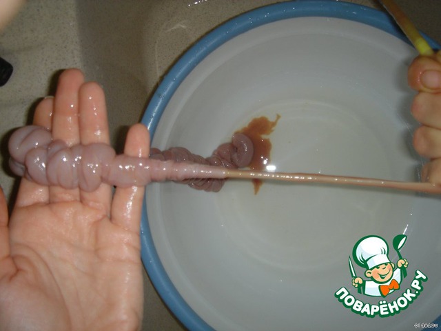 Вымыть кишки, разрезать длинной 60-70 см. Трубочкой для коктейля, зацепить срез кишки, продев срез вовнутрь. Насодить всю кишку на трубочку.