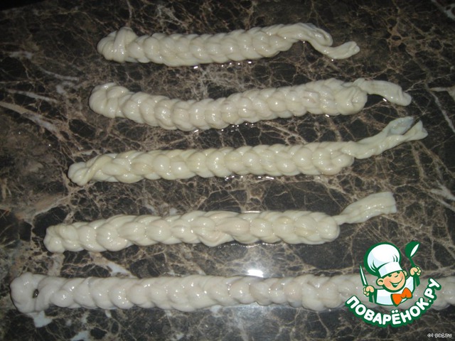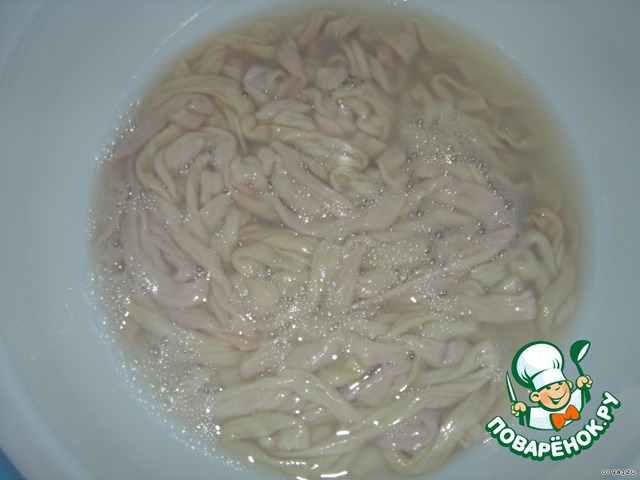 Смыть уксус водой. Можете заплести косичку, или оставить как есть. Залить водой и отварить 10 мин. Кишки могут слипнуться, но это не страшно, нарежте кишки на мелкие кусочки по 1 см. Кишки и внутренности Вы можете подготовить с вечера.