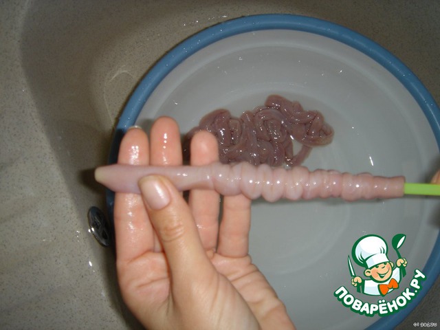 На конце трубочки Вы увидите вывернутую кишку. Выверните еe до конца. Тоже самое проделать со всеми кишками. Хорошо вымыть.