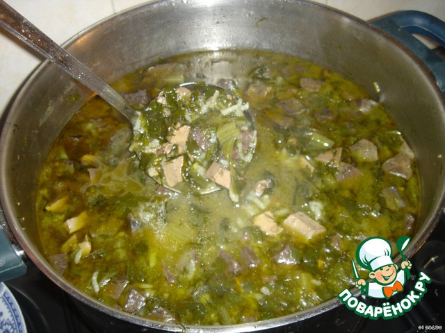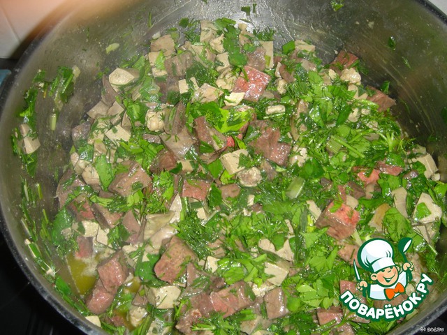 Добавьте внутренности, кишки, петрушку, укроп, специи и 2 черпачка бульона.