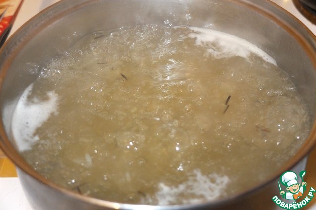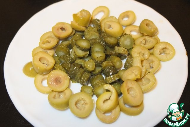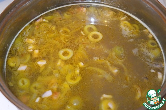 В кастрюлю с бульоном и рисом засыпаем овощи с копченостями, корнишоны и оливки.