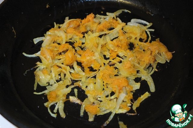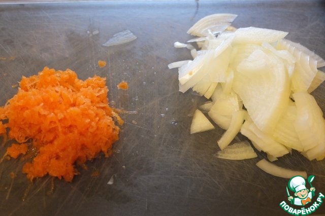 Пока варится рис, нарезаем лук четвертинками колечек, морковь трем на мелкой терке.