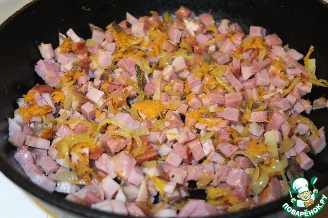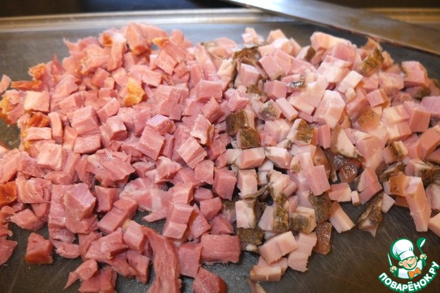 Добавляем копчености, обжариваем пару минут, снимаем с огня.