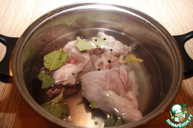 Варим мясной бульон с добавлением душистого перца, лаврового листа и соли.
