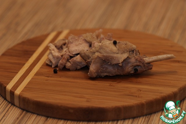 Готовое мясо достаем из бульона и нарезаем небольшими кусочками