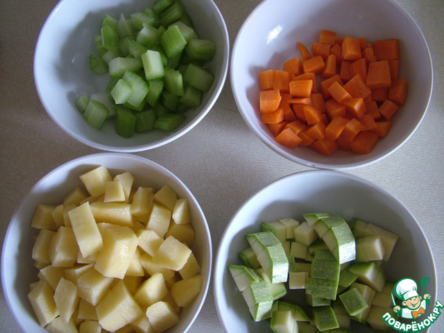Овощи (кроме брокколи) нарезаем средними кубиками, чеснок мелко рубим.
