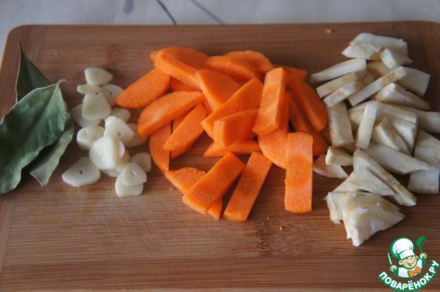 Лук, чеснок, морковь и сельдерей очистить. Половину морковки, половину сельдерея и чеснок нарезать ломтиками. Луковицу надрезать крест-накрест.