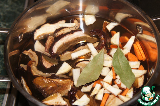 Сухие грибы тщательно промыть водой, положить в кастрюлю, добавить луковицу, морковку, сельдерей, чеснок, лавровый лист, влить 2 л воды, довести до кипения и на слабом огне варить 20 минут. Бульон процедить, грибы выбрать, овощи выкинуть.