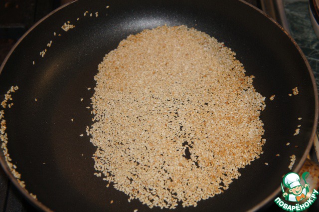 На сухой сковороде слегка обжарить кунжутные семечки.