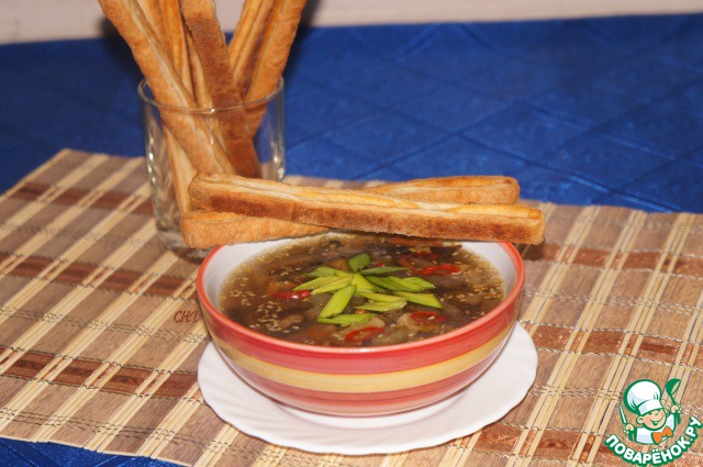| Насыщенный грибной супчик с двумя видами грибов: сухих и свежих. Неожиданное сочетание - новый вкус!!! Идею почерпнула из журнала"Школа гастронома", правда, я его совсем переделала на свой лад... |