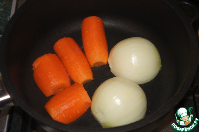 Суп можно сварить и на простой воде, но на овощном бульоне будет несравненно вкуснее. Итак, приступим. Овощи для бульона, а это 1 луковица, небольшая морковь и палочка сельдерея, вымыть и очистить. Морковь разрезать на две части и затем каждую вдоль пополам, луковицу разрезать пополам. На сухой сковороде слегка подпалить срезы моркови и луковицы до золотистого цвета. Сельдерей нарезать ломтиками.