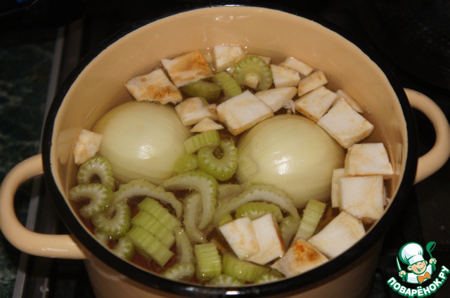 Сложить овощи в кастрюлю, залить холодной водой (около 2-х литров), довести до кипения и варить на слабом огне 40 минут. Затем добавить специи и варить еще 10 минут. Процедить бульон сквозь сито, овощи выкинуть.