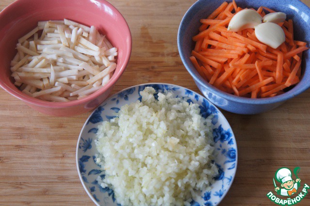 Морковь и сельдерей нашинковать соломкой, лук - кубиками. Чеснок нарезать тонкими пластинками.