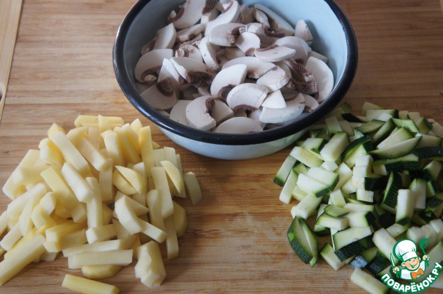 Цуккини и картофель нарезать брусочками, грибы - пластинками или произвольно.