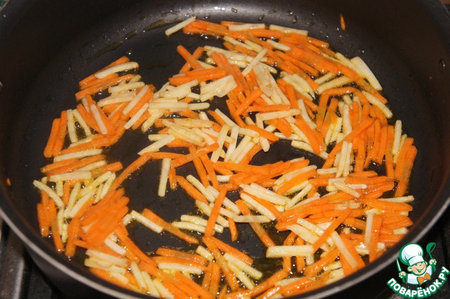 В другой сковороде в еще 1 ст. л. растительного масла спассеровать до полуготовности морковь и сельдерей.