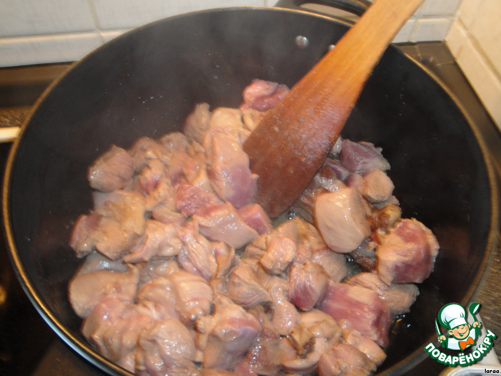 Индюшку нарезать кубиками, как на гуляш.
