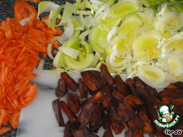 Сушеные абрикосы, лук, лук-порей, морковь нарезать и все добавить к мясу.