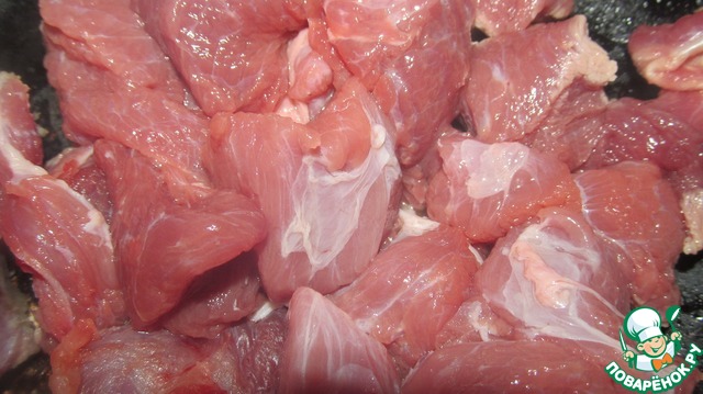 1. Мясо нарезать кусочками ( я брала говядину ), обжарить его до золотистой корочки на оливковом масле.