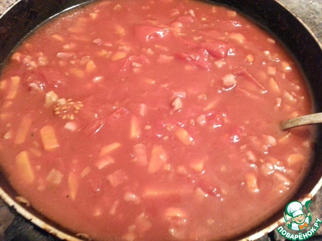 Тушить все 15 минут, всыпать фасоль, влить бульон (я взяла просто воду), разлить по горшочкам и поставить в духовку при 180 градусах на 20-30 минут. Если нет горшочков, можно просто после добавления фасоли потушить 15 минут, просто мне хотелось обновить новенькие горшочки =) Нужно было разлить на 4 горшочка, но у меня было только 3, поэтому залила под завязку их =)