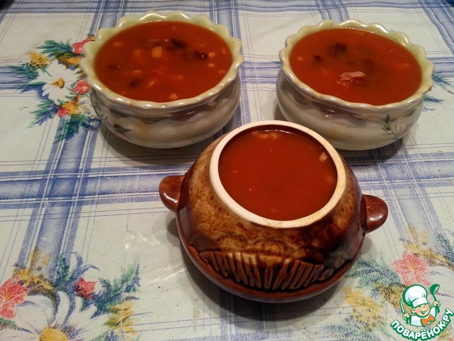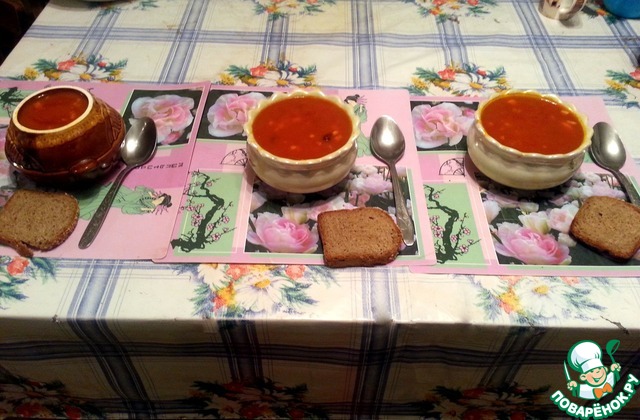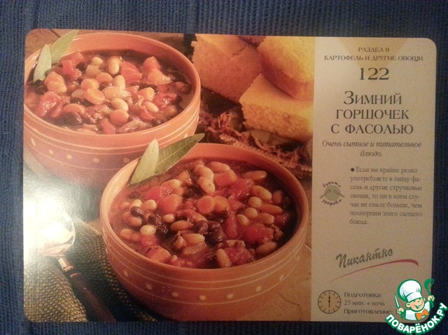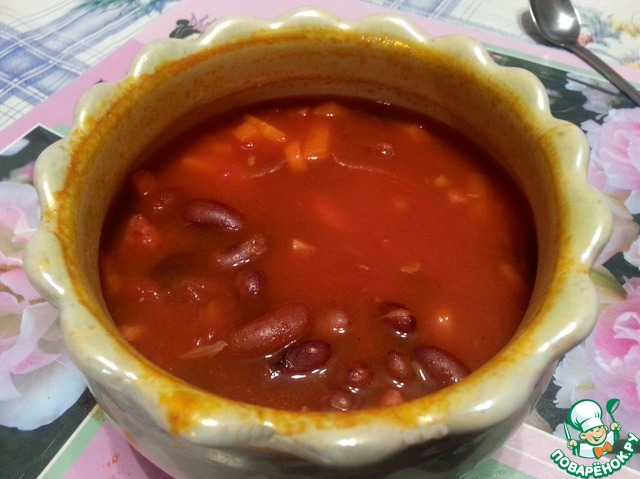 Время приготовления не учитывает приготовления фасоли. На ночь замочить фасоль в холодной воде, у меня была только красная. На следующий день слить воду и отварить фасоль в кастрюле, наполненной водой, под крышкой 45 минут. Фасоль получилась твердоватая, если хотите мягкую, поварите часа 1,5.