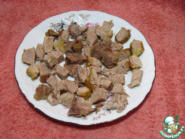 Достать мясо из бульона, удалить кости, нарезать мелкими кусочками.