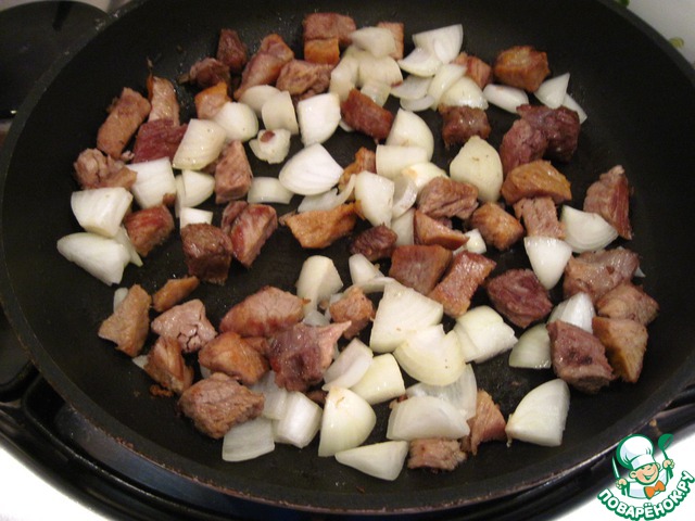 Слегка обжарить на оливковом масле мясо с луком.
