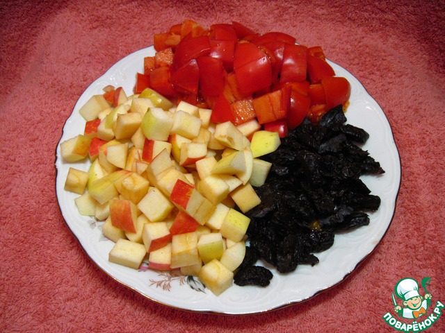 Нарезать кубиками яблоки и помидоры, чернослив - соломкой.