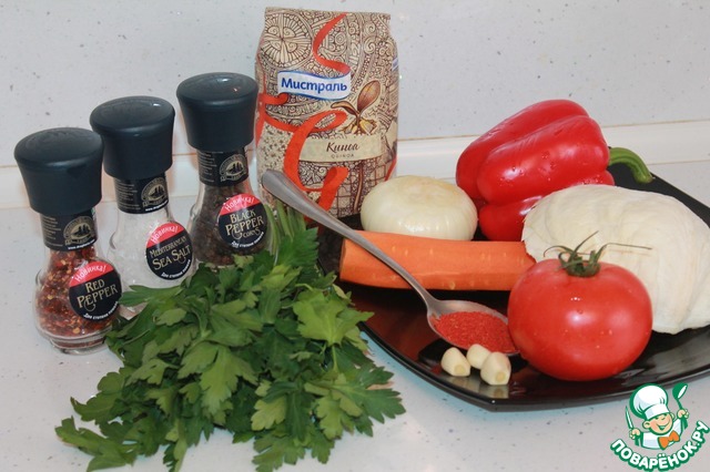 Обжаренные овощи и киноа отправляем в кастрюлю, туда же кладем капусту, помидор, сладкую паприку и заливаем все бульоном.
