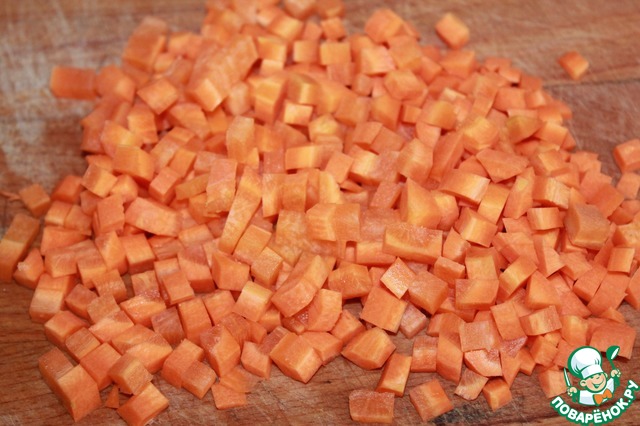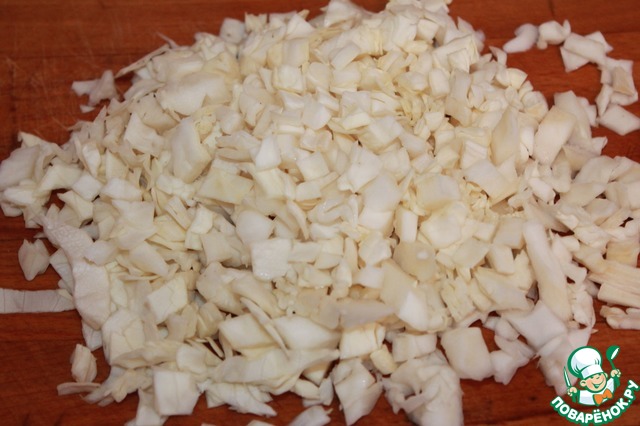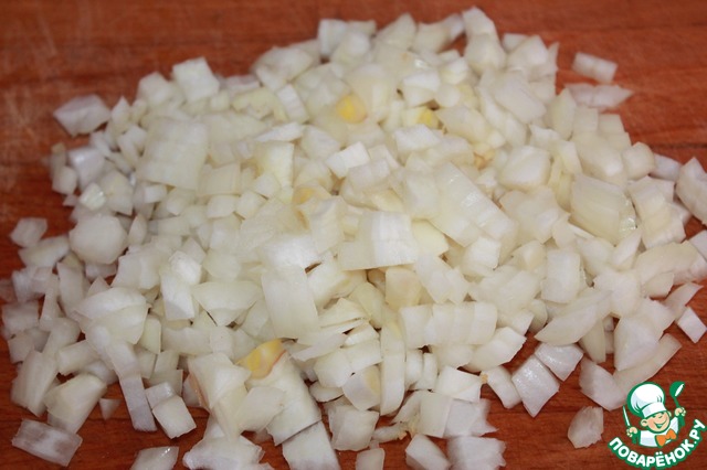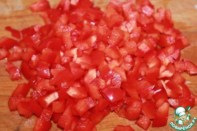 С помидора снимаем кожу, ошпарив его кипятком. Нарезаем кубиком.