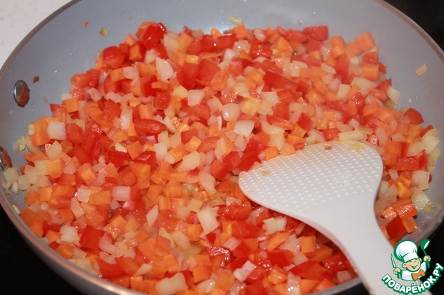 На оливковом или растительном масле обжариваем лук, морковь и перец в течение 3 минут.